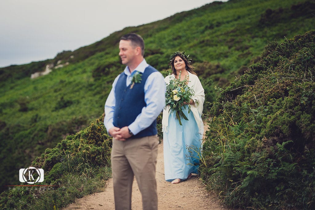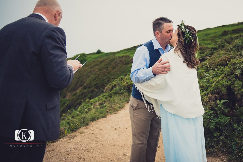 Susan and Sean, originally from North Carolina and Florida, chose to have a cliffside elopement in Howth. Sean has strong family ties to Ireland, and Susan desired a casual, barefoot ceremony, which she achieved, as seen in the photos. Howth Head was quickly decided upon as their ceremony location due to its beautiful scenery, including the Howth Cliff Walk along the cliffs of Northeast Dublin.