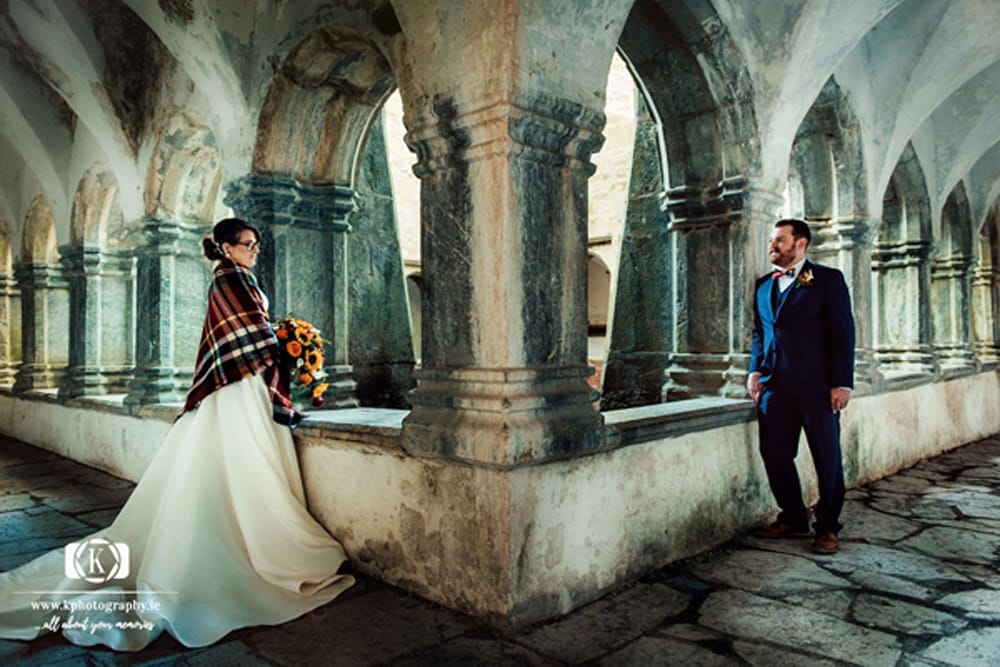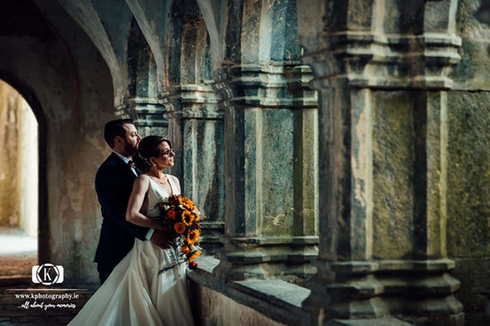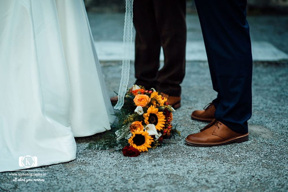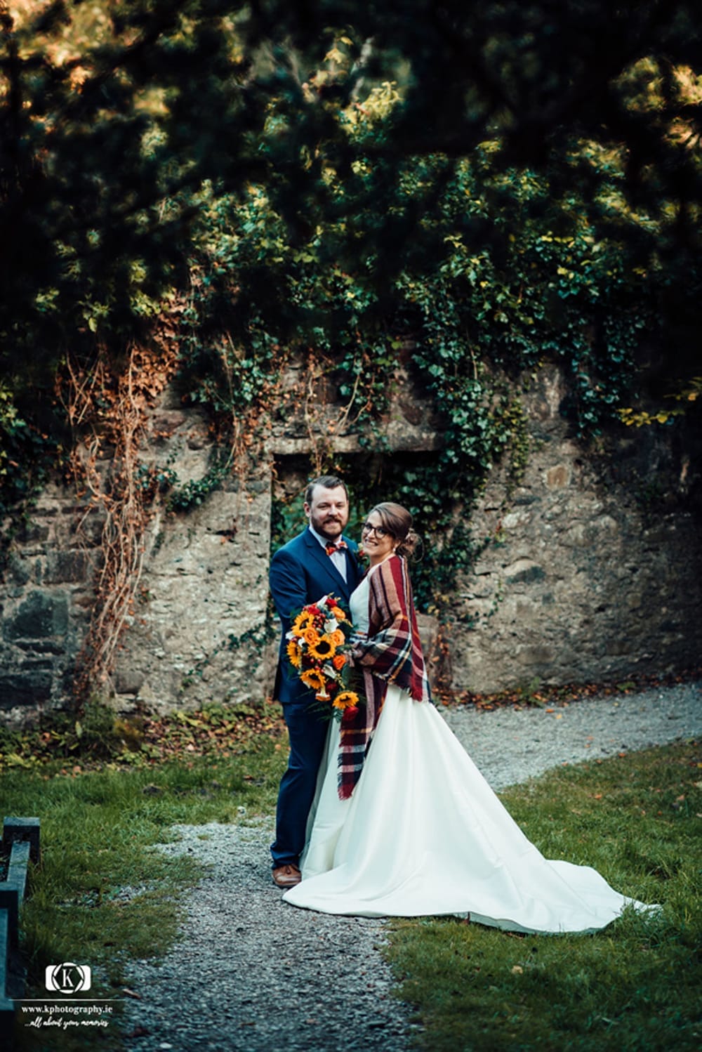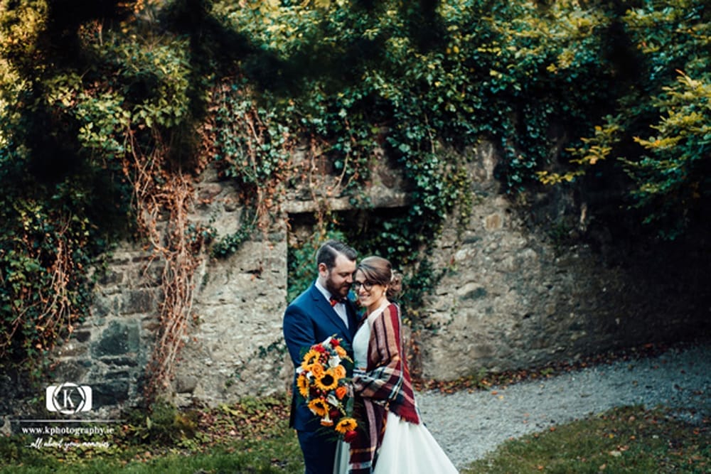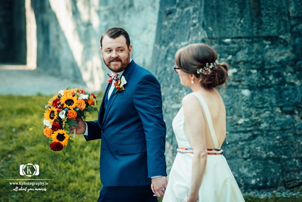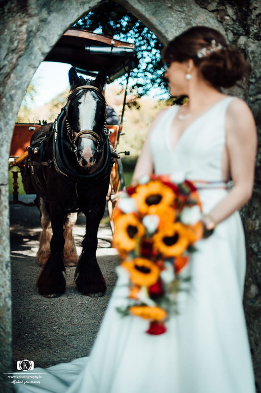 Ginna and Zach knew right off the bat that they wanted an outdoor ceremony, somewhere breathtaking beautiful. A ruin perhaps, somewhere that had its own story, somewhere that you could feel the past while standing on its hallowed ground. Just a short distance from the town itself, Ginna was able to make her way to their altar by horse and carriage a popular way to take in the sights of the area. Wrapped in a blanket provided by the horseman, any Fall chills were kept firmly at bay. The day was a fresh bright one staying light later than many other evenings as though the sun was staying up just for them. A huge thank you as always to our wonderful team on the day, celebrant Ray O’Sullivan, hair and makeup by Sean Taaffe, The bouquet of sunflowers just as she wanted by Every Occasion and pictures by K Photography