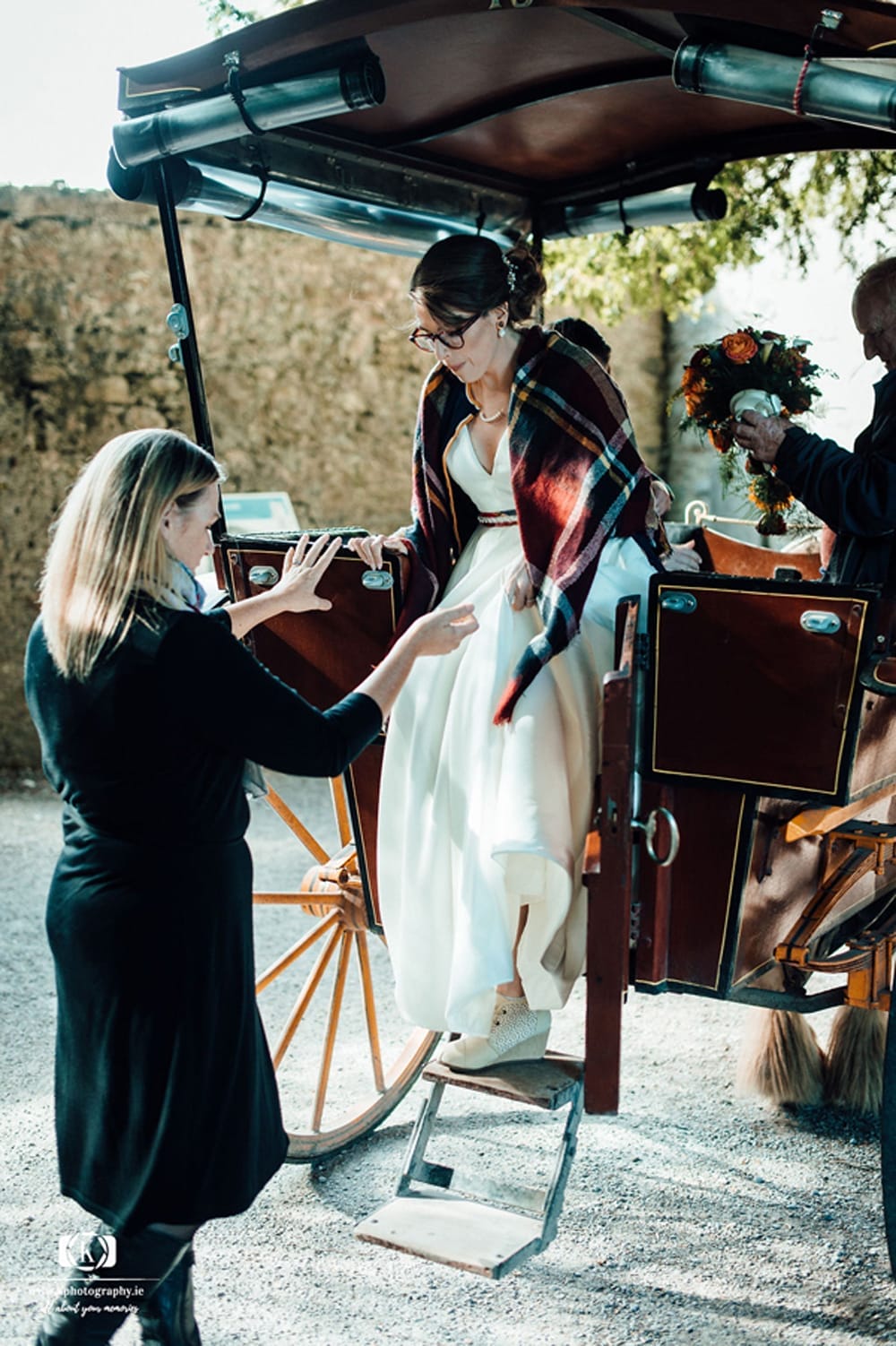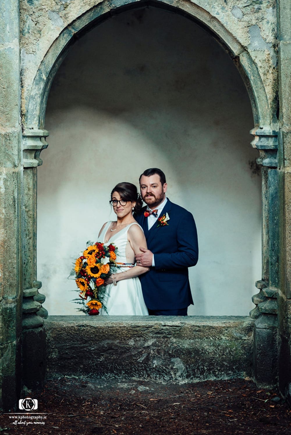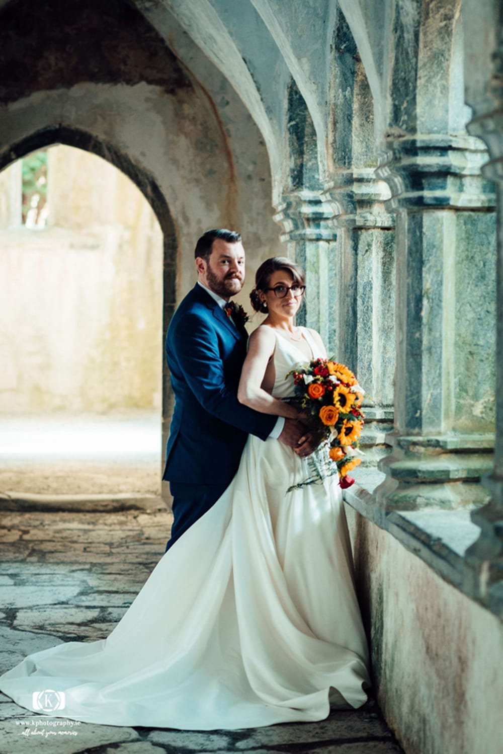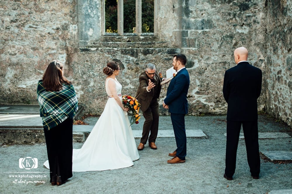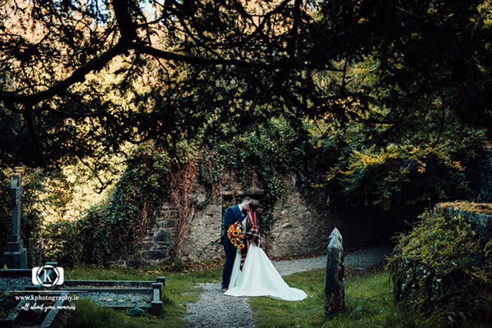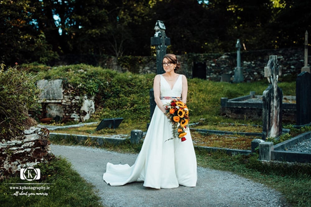 Ginna and Zach knew right off the bat that they wanted an outdoor ceremony, somewhere breathtaking beautiful. A ruin perhaps, somewhere that had its own story, somewhere that you could feel the past while standing on its hallowed ground. Just a short distance from the town itself, Ginna was able to make her way to their altar by horse and carriage a popular way to take in the sights of the area. Wrapped in a blanket provided by the horseman, any Fall chills were kept firmly at bay. The day was a fresh bright one staying light later than many other evenings as though the sun was staying up just for them. A huge thank you as always to our wonderful team on the day, celebrant Ray O’Sullivan, hair and makeup by Sean Taaffe, The bouquet of sunflowers just as she wanted by Every Occasion and pictures by K Photography