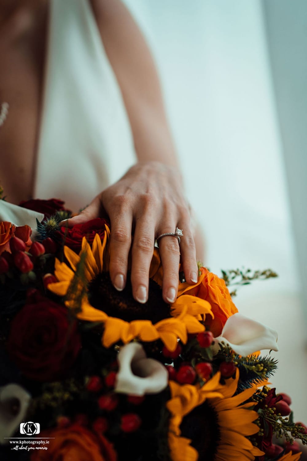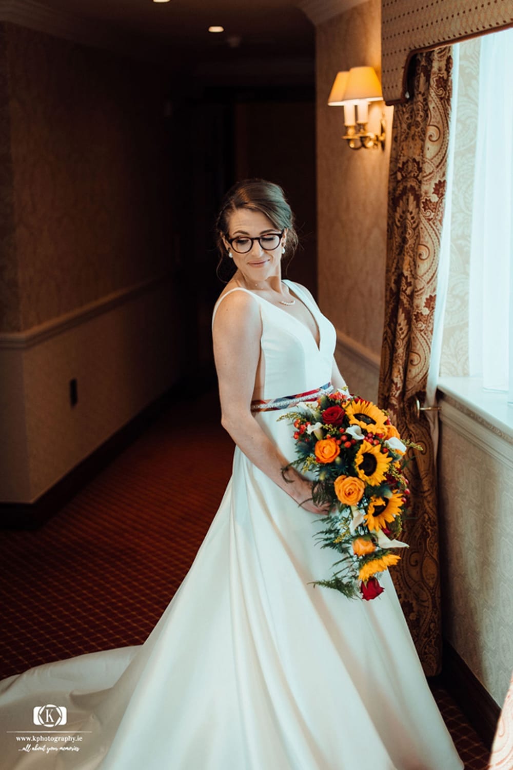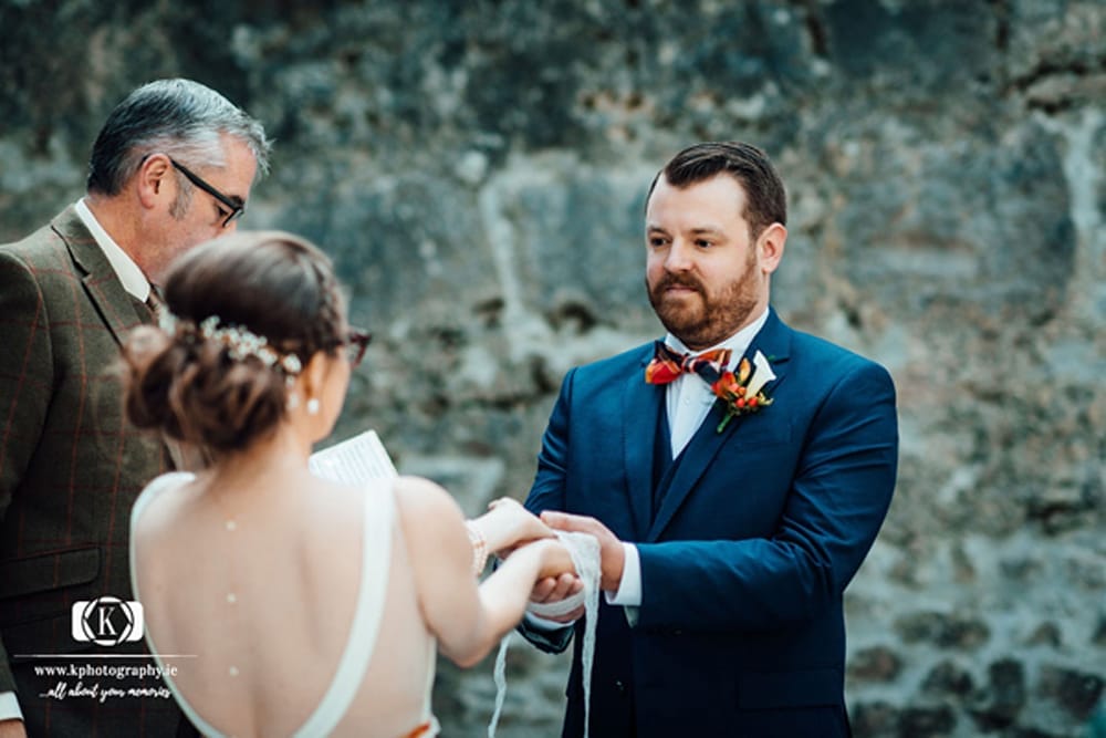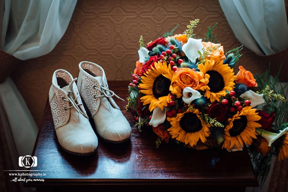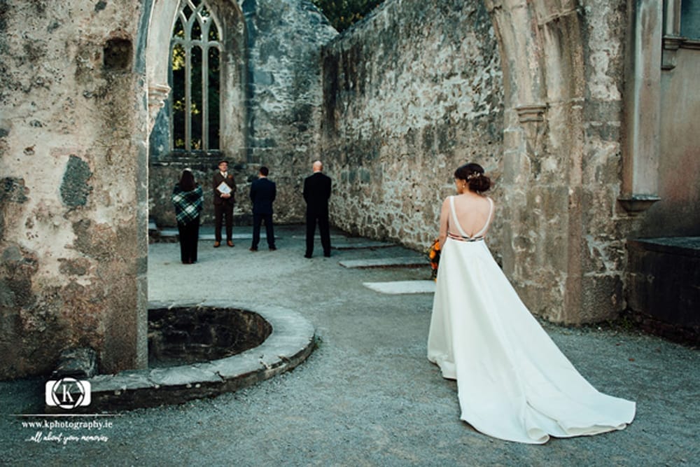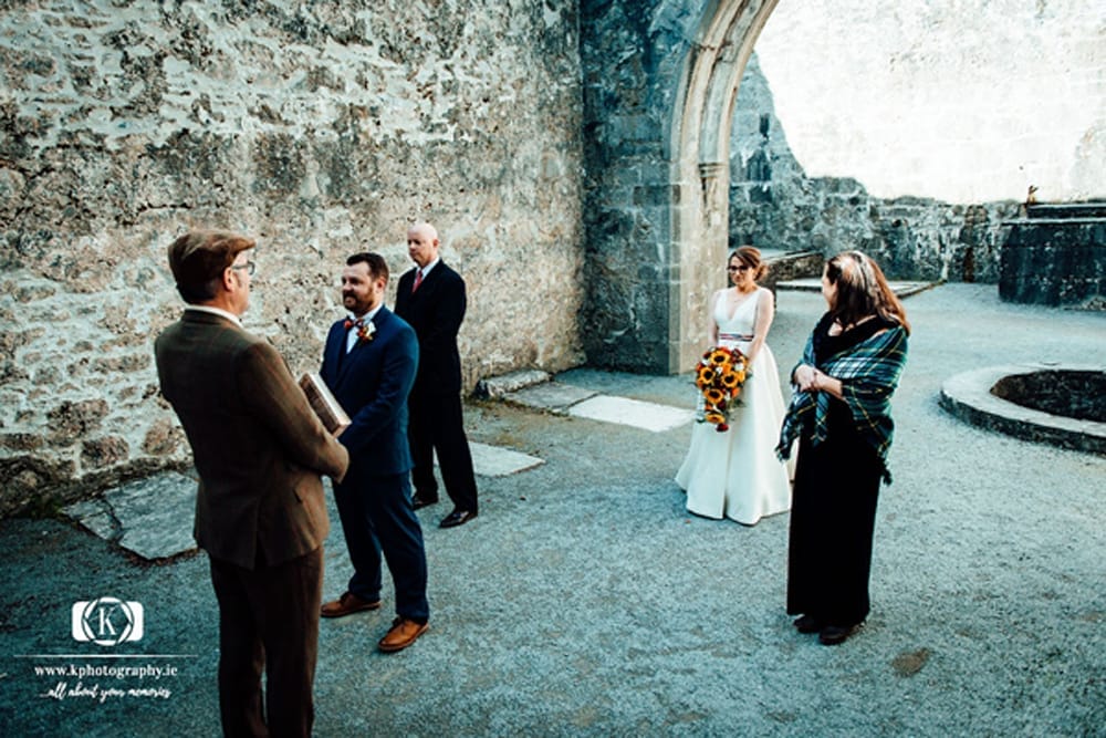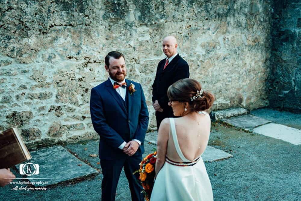 Ginna and Zach knew right off the bat that they wanted an outdoor ceremony, somewhere breathtaking beautiful. A ruin perhaps, somewhere that had its own story, somewhere that you could feel the past while standing on its hallowed ground. Just a short distance from the town itself, Ginna was able to make her way to their altar by horse and carriage a popular way to take in the sights of the area. Wrapped in a blanket provided by the horseman, any Fall chills were kept firmly at bay. The day was a fresh bright one staying light later than many other evenings as though the sun was staying up just for them. A huge thank you as always to our wonderful team on the day, celebrant Ray O’Sullivan, hair and makeup by Sean Taaffe, The bouquet of sunflowers just as she wanted by Every Occasion and pictures by K Photography